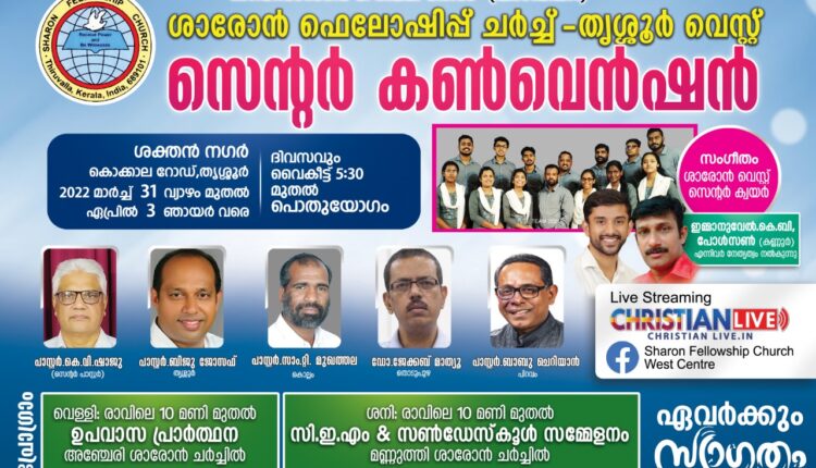 തൃശൂർ: ശാരോൻ ഫെലോഷിപ്പ് ചർച്ച് തൃശൂർ വെസ്റ്റ് സെന്റർ കൺവൻഷൻ മാർച്ച് 31 മുതൽ ഏപ്രിൽ 3 ഞായർ വരെ ശക്തൻ നഗറിൽ വച്ച് നടക്കും.