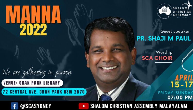 സിഡ്നി: ദൈവത്തിനു മഹത്വം സിഡ്നി ശാലോം ക്രിസ്ത്യൻ അസംബ്ലിയുടെ ആഭിമുഖ്യത്തിൽ ഏപ്രിൽ മാസം പതിനഞ്ചാം തീയതി മുതൽ പതിനേഴാം തീയതി വരെ വൈകുന്നേരങ്ങളിൽ 7 മണി മുതൽ ഓറൻ പാർക്ക് ലൈബ്രറി ഓഡിറ്റോറിയത്തിൽ വച്ച് മൂന്ന് ദിവസത്തെ കൺവെൻഷൻ നടത്തപ്പെടുന്നു. പ്രസ്തുത മീറ്റിംഗിൽ അനുഗ്രഹിക്കപ്പെട്ട ഉണർവ് പ്രസംഗകൻ പാസ്റ്റർ ഷാജി എം പോൾ ദൈവ വചന ശുശ്രൂഷ നിർവഹിക്കുകയും എസ് സി എ ക്വയർ ഗാനങ്ങൾ ആലപിക്കുകയും ചെയ്യും. ബഹുമാന്യരായ ദൈവദാസൻ മാരെയും ദൈവ മക്കളെയും സുവിശേഷ സ്നേഹികളെയും ഈ മീറ്റിങ്ങ് ലേക്ക് ഹാർദവമായി സ്വാഗതം ചെയ്യുന്നു.