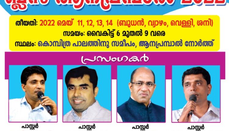എടത്വാ: അസംബ്ലിസ് ഓഫ് ഗോഡ് ആനപ്രമ്പാൽ സഭയുടെ ആഭിമുഖ്യത്തിൽ ‘ബ്ലസ് ആനപ്രമ്പാൽ 2022’ മെയ് 11 ബുധനാഴ്ച മുതൽ 14 ശനിയാഴ്ച വരെ വൈകിട്ട് 6 ന് ആനപ്രമ്പാൽ വടക്ക് കൊമ്പത്ര പാലത്തിന് സമീപം നടക്കും.