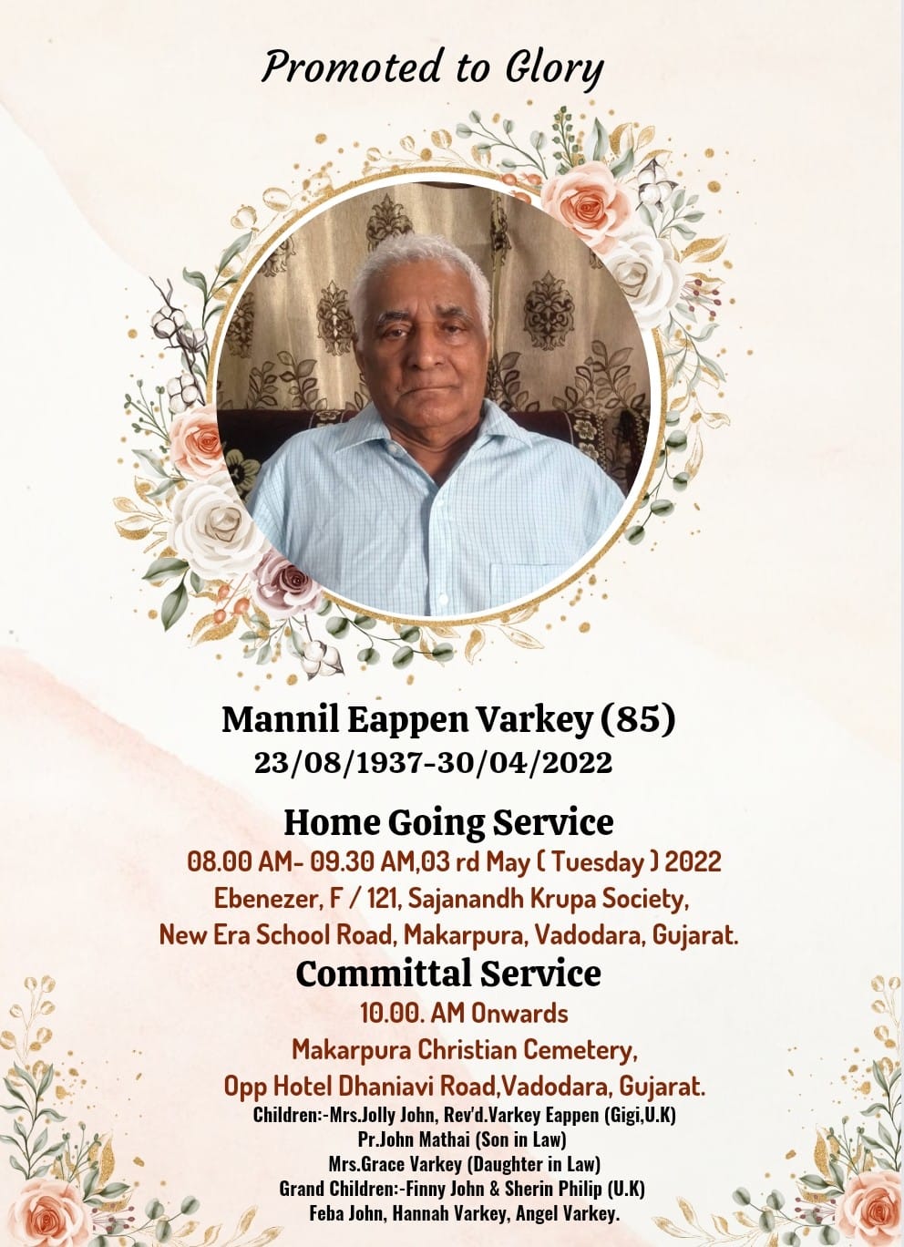 വഡോദര/ ഗുജറാത്ത്: കഴിഞ്ഞ ദിവസം നിത്യതയിൽ ചേർക്കപ്പെട്ട മല്ലപള്ളി മണ്ണിൽ ഈപ്പൻ വർക്കിയുടെ (85) സംസ്കാര ശുശ്രൂഷ നാളെ രാവിലെ 8 മണിക്ക് ഭവനത്തിലെ ശുശ്രൂഷയെ തുടർന്ന് 10 മണിക്ക് മക്കാർപുര ക്രിസ്റ്റ്യൻ സെമിത്തേരിൽ നടക്കും. ഭാര്യ: പരേതയായ ലീലാമ്മ, മക്കൾ: ജോളി ജോൺ , വർക്കി ഈപ്പൻ (ജിജി യു കെ), മരുമക്കൾ: പാസ്റ്റർ ജോൺ മത്തായി, ഗ്രേസ് വർക്കി.