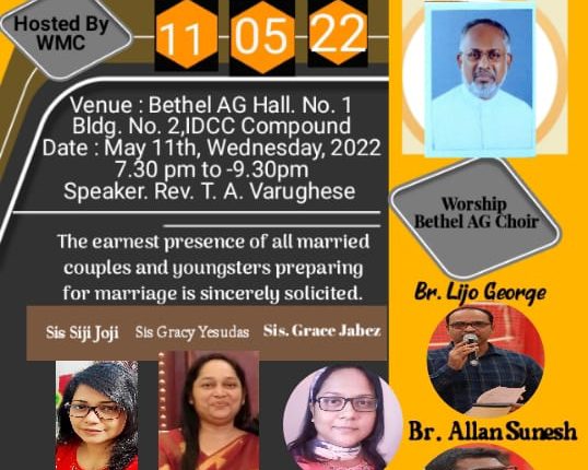 ഖത്തർ: അസ്സെംബ്ലീസ് ഓഫ് ഗോഡ് സഭയുടെ പുത്രികാ സംഘടനയായ ‘WMC’ യുടെ ആഭിമുഖ്യത്തിൽ Family – Biblical Foundations & Present Day Challenges എന്ന വിഷയത്തിൽ ദോഹ ബെഥേൽ ഏ.ജി സഭയിൽ ‘ഫാമിലി റിട്രീറ്റ്’ 11 മെയ് 2022, ബുധനാഴ്ച വൈകിട്ട് 7.30 മുതൽ 9.30 വരെ നടത്തപ്പെടും.