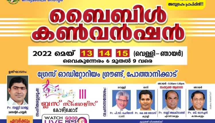 നേര്യമംഗലം: ഐപിസി നേര്യമംഗലം സെന്റർ കൺവൻഷൻ മെയ് 13, 14, 15 തീയതികളിൽ പോത്താനിക്കാട് ഗ്രേസ് ഓഡിറ്റോറിയം ഗ്രൗണ്ടിൽ നടക്കും. സെന്റർ പ്രസിഡന്റ് പാസ്റ്റർ സണ്ണി മാത്യു ഉദ്ഘാടനം നിർവ്വഹിക്കും. എല്ലാ ദിവസവും വൈകിട്ട് 6 മുതൽ ആരംഭിക്കുന്ന യോഗങ്ങളിൽ പാസ്റ്റർമാരായ പി.സി ചെറിയാൻ (റാന്നി), കെ ജെ തോമസ് (കുമളി), ബി.മോനച്ചൻ (കായംകുളം) എന്നിവർ പ്രസംഗിക്കും. ബ്ലസ് സിംഗേഴ്സ്, കോഴിക്കോട് ഗാനശുശ്രൂഷയ്ക്ക് നേതൃത്വം നൽകും. ഞായറാഴ്ച രാവിലെ 9 ന് നടക്കുന്ന സെന്ററിന്റെ സംയുക്ത ആരാധനയിൽ പാസ്റ്റർ സണ്ണി അലക്സാണ്ടർ (എറണാകുളം) മുഖ്യ പ്രഭാഷകനായിരിക്കും.