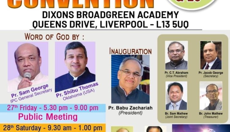 യു.കെ: ഐ.പി.സി യു.കെ & അയർലന്റ് റീജിയൻ 15-ാമത് വാർഷിക കൺവെൻഷൻ മെയ് 27, 28, 29 തീയതികളിൽ യുകെയിലെ വടക്ക് പടിഞ്ഞാറുള്ള ലിവർപൂൾ പട്ടണത്തിൽ ഡിക്സൻ ബോഡ്ഗ്രീൻ അക്കാഡമിയിൽ (Dixons Broadgreen Academy, Queens Drive, Liverpool, L13 5UQ) നടക്കും.