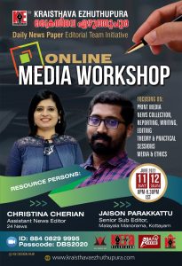 തിരുവല്ല: ക്രൈസ്തവ എഴുത്തുപുര ദിനപത്രം എഡിറ്റോറിയൽ ടീമിന്റെ ആഭിമുഖ്യത്തിലുള്ള പ്രഥമ മീഡിയ വർക്ക്ഷോപ്പ് ജൂൺ 11,12 തീയതികളിൽ സൂം പ്ലാറ്റ്ഫോമിൽ നടക്കും. എഴുത്തിന്റെ മേഖലയിലെ പുതുമുഖങ്ങൾക്കും എഴുത്തുകാരായി തുടരുന്നവർക്കും മാധ്യമ, പത്രപ്രവർത്തന മേഖലയിൽ അഭിരുചിയുള്ളവർക്കും ഈ വർക്ക്ഷോപ്പിൽ പങ്കെടുക്കാം. ക്രിസ്റ്റിന ചെറിയാൻ (അസിസ്റ്റന്റ് ന്യൂസ് എഡിറ്റർ, 24ന്യൂസ്), ജെയ്സൻ പറക്കാട്ട് (സീനിയർ സബ് എഡിറ്റർ, മലയാള മനോരമ, കോട്ടയം) എന്നിവർ മുഖ്യ അതിഥികൾ ആയിരിക്കും. വാർത്ത ശേഖരണം, റിപ്പോർട്ടിങ്, എഡിറ്റിങ്, തിയറിയും പ്രായോഗിക പരിശീലനവും ഈ വർക്ക് ഷോപ്പിൽ നൽകുന്നതാണ്.