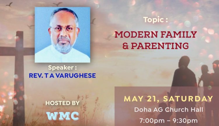 ഖത്തർ: ദോഹ അസ്സെംബ്ലിസ് ഓഫ് ഗോഡ് വിമൻസ് മിഷനറി കൗൺസിലിന്റെ (WMC) ആഭിമുഖ്യത്തിൽ MODERN FAMILY & പാരന്റിങ് (ആധുനിക കുടുംബവും രക്ഷകർത്താക്കളുടെ ഉത്തരവാദിത്വവും) എന്ന വിഷയത്തെ ആസ്പദമാക്കി ഫാമിലി റിട്രീറ്റ് നടക്കും. മെയ് 21 ന് ഖത്തർ സമയം വൈകിട്ട് 7ന് (ഇന്ത്യൻ സമയം രാത്രി 9.30)ന് ആരംഭിക്കുന്ന മീറ്റിംഗിൽ ക്ലാസുകൾ നയിക്കുന്നത് ദീർഘ കാലം മാർത്തോമ്മാ സഭാ വികാരി ആയിരുന്ന റവ ടി എ വർഗീസ് ആണ്. പ്രസ്തുത മീറ്റിംഗിൽ ദോഹ AG WMC ഗാന ശുശ്രുഷകൾക്ക് നേതൃത്വം നൽകും.