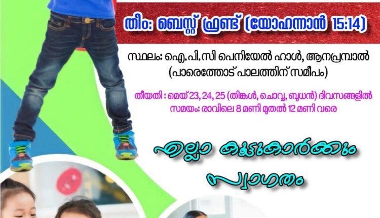 എടത്വാ: ആനപ്രമ്പാൽ പെനിയേൽ ഐ.പി.സി സഭയുടെ ആഭിമുഖ്യത്തിൽ വി.ബി.എസ്സ് 2022 മെയ് 23, 24, 25 തീയതികളിൽ ദിവസവും രാവിലെ 8 മണി മുതൽ 12 മണി വരെ ആനപ്രമ്പാൽ പെനിയേൽ ഐ.പി.സി സഭയുടെ ഹാളിൽ വെച്ച് നടക്കും.