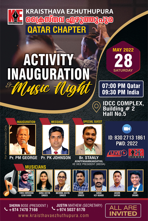 ക്രൈസ്തവ എഴുത്തുപുര ഖത്തർ ചാപ്റ്റർ പ്രവർത്തനോദ്ഘാടനവും മ്യൂസിക് നൈറ്റും ഇന്ന്