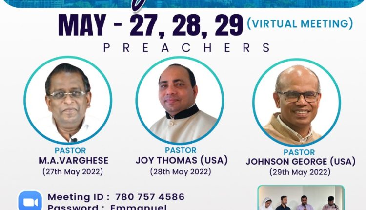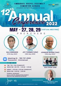 എഡ്മൺടൺ: ഇമ്മാനുവേൽ ഗോസ്പൽ അസംബ്ലി പന്ത്രണ്ടാമത് വാർഷിക കോൺഫറൻസ് ഇന്ന് (മെയ് 27) മുതൽ 29 വരെ സൂം പ്ലാറ്റ്ഫോമിലൂടെ നടത്തപ്പെടുന്നു.