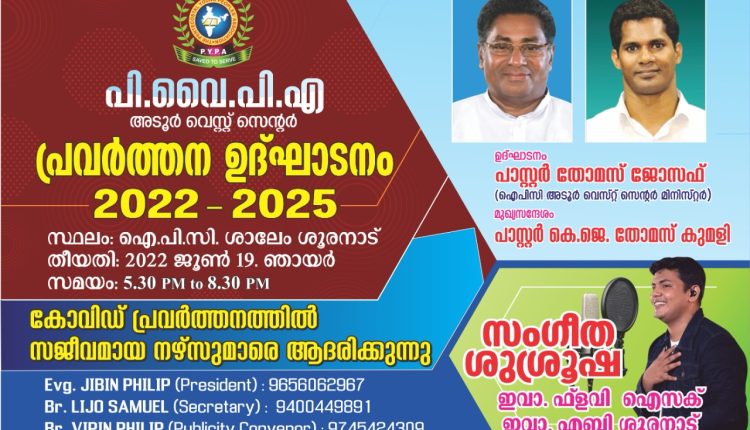 അടൂർ: പി വൈ പി എ അടൂർ വെസ്റ്റ് സെന്ററിന്റെ 2022-25 വർഷത്തെ പ്രവർത്തന ഉത്ഘാടനം 2022 ജൂൺ 19 ഞായറാഴ്ച വൈകിട്ട് 5:30 മുതൽ ഐപിസി ശാലേം ശൂരനാട് സഭയിൽ വെച്ചു നടക്കും. ഇവ. ജോർജ് തോമസ് അധ്യക്ഷത വഹിക്കുന്ന മീറ്റിംഗിൽ അടൂർ വെസ്റ്റ് സെന്റർ മിനിസ്റ്റർ പാസ്റ്റർ തോമസ് ജോസഫ് പ്രവർത്തന ഉത്ഘാടനം നടത്തുകയും പാസ്റ്റർ കെ ജെ തോമസ് കുമളി മുഖ്യ സന്ദേശംനൽകയും ചെയ്യും. സംഗീതശുശ്രൂഷക്ക് ഇവാ. ഫ്ളവി ഐസക് നേതൃത്വം നൽകും. കോവിഡ് പ്രതിരോധ പ്രവർത്തനത്തിൽ സജീവമായ സെന്ററിലെ ആരോഗ്യ പ്രവർത്തകരെ ആദരിക്കുകയും ചെയുന്നു. മീറ്റിംഗിന് പ്രസിഡന്റ് ഇവ: ജിബിൻ ഫിലിപ്പ്, സെക്രട്ടറി ലിജോ സാമുവൽ, ട്രഷറർ ഫിന്നി വർഗീസും സെന്റർ പി. വൈ. പി. എ കമ്മറ്റിയും നേതൃത്വം നൽകുമെന്ന് പബ്ലിസിറ്റി കൺവീനർ വിപിൻ ഫിലിപ്പ് അറിയിച്ചു.