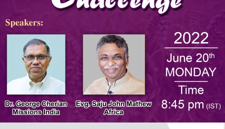 എറണാകുളം: ഇന്റർസെസേഴ്സ് ഫോർ ഇൻഡ്യയുടെ അഭിമുഖ്യത്തിൽ മിഷൻ ചലഞ്ച് കോൺഫറൻസ് ഇന്ന് ജൂൺ 20, വൈകീട്ട് ഇൻഡ്യൻ സമയം 08:45 മുതൽ സൂമിലൂടെ നടക്കും. ഡോ. ജോർജ്ജ് ചെറിയാൻ ഇവാ. സാജു ജോൺ മാത്യു എന്നിവർ പ്രസംഗിക്കും.