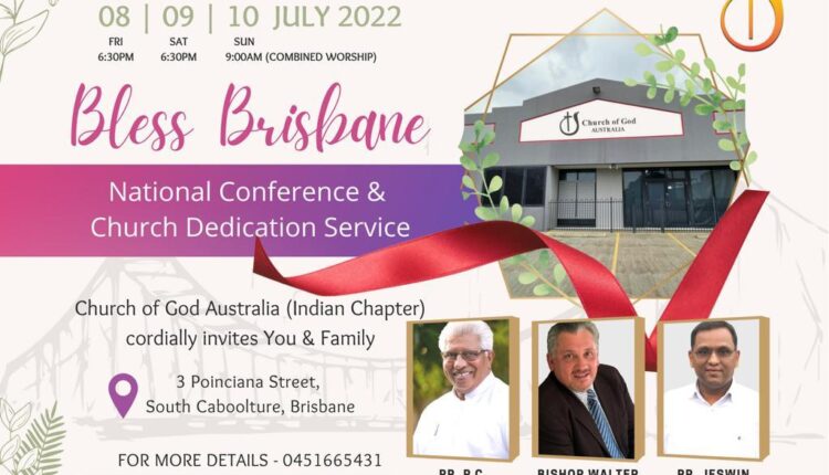 ഓസ്ട്രേലിയ: ചർച്ച് ഓഫ് ഗോഡ് ഓസ്ട്രേലിയയുടെ ഇൻഡ്യൻ ചാപ്റ്ററിന്റെ മൂന്നാമത് നാഷണൽ കോൺഫറൻസിനും ആലയ സമർപ്പണ ശുശ്രുഷക്കും ബ്രിസ്ബൺ കബൂൾചർ വേദിയാകുന്നു. ജൂലൈ മാസം 8,9,10 തീയതികളിൽ ബ്രിസ്ബെയ്നിൽ വച്ച് നടത്തുവാൻ തീരുമാനിച്ചിരിക്കുന്ന മീറ്റിംഗുകൾക്ക് ഓസ്ട്രേലിയ ചർച്ച് ഓഫ് ഗോഡ് ഓവർസീയർ റവ. ബിഷപ് വാൾട്ടർ അൾവാറസ് ഉദ്ഘാടനം നിർവ്വഹിക്കും. ഈ മീറ്റിംഗുകളിൽ പാസ്റ്റർ പി സി ചെറിയാൻ ദൈവവചനം ശുശ്രൂഷിക്കുകയും വിവിധ ദൈവദാസീദാസന്മാർ ഗാനശുശ്രൂഷകൾക്ക് നേതൃത്വം നൽകുകയും ചെയ്യും. ചർച്ച് ഓഫ് ഗോഡ് ഓസ്ട്രേലിയ ഇൻഡ്യൻ ചാപ്റ്ററിന്റ് കീഴിലുള്ള എല്ലാ സഭകളും , ബ്രിസ്ബെയ്നിലുള്ള മറ്റിതര പെന്തക്കോസ്തു സഭകളും പങ്കെടുക്കും.