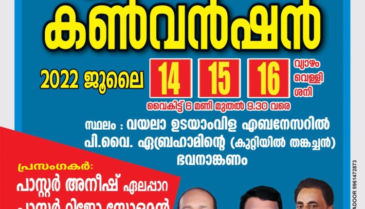 ജൂലൈ 14,15,16 തീയതികളിൽ വയലാ ഉടയാംവിള ജംഗ്ഷനിൽ എബനേസറിൽ പി വൈ എബ്രഹാമിന്റെ ഭവനാങ്കണത്തിൽ വെച്ച് കൺവൻഷൻ നടക്കും. ദിവസവും വൈകിട്ട് 6 മുതൽ 9:30 വരെ നടക്കുന്ന യോഗങ്ങളിൽ