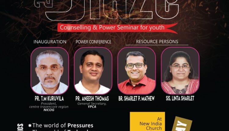കുറിച്ചി: ന്യൂ ഇന്ത്യാ ചർച്ച് ഓഫ് ഗോഡ് കുറിച്ചി സഭയുടെയും വൈ. പി.സി.എ ചങ്ങനാശ്ശേരി സെന്ററിന്റെയും സംയുക്ത ആഭിമുഖ്യത്തിൽ യുവജനങ്ങൾക്കായി കൗൺസിലിംഗും പവ്വർ സെമിനാറും (ബ്ലെയ്സ് – 2022) ആഗസ്റ്റ് 15 തിങ്കളാഴ്ച രാവിലെ 9 മുതൽ വൈകുന്നേരം 5 വരെ കുറിച്ചി ന്യൂ ഇന്ത്യാ ചർച്ച് ഓഫ് ഗോഡ് ഹാളിൽ നടക്കും. സെന്റർ ട്രാവൻകൂർ പ്രസിഡന്റെ പാസ്റ്റർ റ്റി. എം. കുരുവിള ഉത്ഘാടനം ചെയ്യുന്ന മീറ്റിംഗിൽ ബ്രദർ ഷാർലെറ്റ് പി.മാത്യു, ലിൻ്റൊ ഷാർലെറ്റ്, പാസ്റ്റർ അനീഷ് തോമസ് തുടങ്ങിയവർ വിവിധ സെഷനുകളിൽ സംസാരിക്കും. സമ്മർദ്ദങ്ങളുടെ ലോകം, ടെക്നോളജിയുടെ ലോകം, ബന്ധങ്ങളുടെ ലോകം തുടങ്ങിയ വിഷയങ്ങളിലാണ് ക്ലാസ്സുകൾ നടക്കുന്നത്. 13 മുതൽ 30 വരെ പ്രായപരിധിയിലുള്ളവർക്ക് വേണ്ടിയാണ് ക്ലാസ്സുകൾ ക്രമീകരിച്ചിരിക്കുന്നത്. ആദ്യം രജിസ്റ്റർ ചെയ്യുന്ന 100 പേർക്ക് മാത്രമേ പ്രവേശനം ഉണ്ടായിരിക്കുകയുള്ളൂ. പ്രവേശനം സൗജന്യമാണ്.