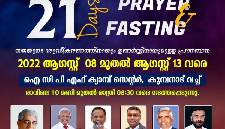 ഉപവാസ പ്രാർത്ഥനയുടെ അവസാന വാരമായ നാളെ മുതൽ മധ്യ മേഖലയിൽ നടത്തപെടുന്ന ഉപവാസ പ്രാർത്ഥന ആഗസ്റ്റ് 08 മുതൽ 13 വരെ എല്ലാ ദിവസവും രാവിലെ 10 മണി മുതൽ രാത്രി 8:30 വരെ വിവിധ സെഷനുകളായി ഐ സി പി എഫ് ക്യാമ്പ് സെന്റർ, കുമ്പനാട് വെച്ച് നടത്തപെടുന്നു. ദൂരെ നിന്നും വന്നു ചേരുന്നവർക്ക് മുൻകൂട്ടി അറിയിക്കുന്ന പ്രകാരം താമസസൗകര്യവും ചുമതലക്കാർ ക്രമീകരിച്ചിട്ടുണ്ട്. സഭയുടെ ശുദ്ധീകരണത്തിനായും ഉണർവിനായും നടത്തപെടുന്ന ഉപവാസ പ്രാർത്ഥന മേഖലകളിലെ എല്ലാ ദൈവദാസന്മാരും കുടുംബമായി ദൈവജനത്തോടൊപ്പം വന്നു സംബന്ധിക്കുന്നു. റവ.ടിജെ സാമുവേൽ നേതൃത്വം നൽകുന്ന ഡിസ്ട്രിക്ട് എക്സിക്യൂട്ടീവ് കമ്മറ്റിയോടൊപ്പം മേഖല ഡയറക്ടർമാരും പ്രസ്ബിറ്റേഴ്സും ഉപവാസ പ്രാർത്ഥനകൾക്ക് നേതൃത്വം നൽകുന്നു.