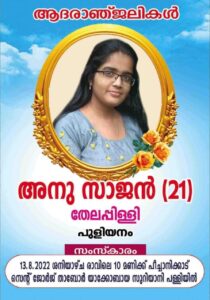 പീച്ചാനിക്കാട്: അങ്കമാലി പുളിയനം തേലപ്പിള്ളി ടി. ജി. സാജന്റേയും,സിന്ധുവിന്റെയും മകൾ അങ്കമാലി മോർണിംഗ് സ്റ്റാർ കോളേജ് അവസാന വർഷ സുവോളജി ബിരുദ വിദ്യാർത്ഥിനിയുംപീച്ചാനിക്കാട് മൗണ്ട് താബോർ സണ്ടേസ്ക്കൂളിലെ അദ്ധ്യാപികയുമായ അനു സാജൻ (21) കർത്താവിൽ നിദ്രപ്രാപിച്ചു.