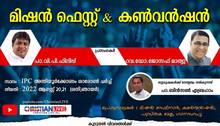 വൈകുന്നേരം 6 മണി മുതൽ നടക്കുന്ന മിഷൻ കൺവൻഷനിൽ പാസ്റ്റർവി.പി.ഫിലിപ്പ് ( ഐ.പി.സി. താബോർ, തിരുവനന്തപുരം), റവ.ഡോ.ജോസഫ് മാത്യു (Director,LTWM) എന്നിവർ വചന സന്ദേശം നൽകും.
