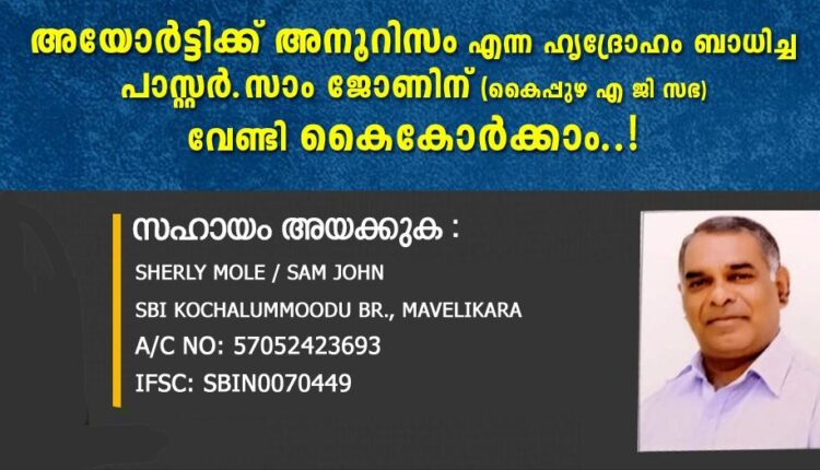 അയോർട്ടിക്ക് അനൂറിസം എന്ന ഹൃദ്രോഗം ബാധിച്ച പാസ്റ്റർ സാം ജോണിനു (കൈപ്പുഴ എ.ജി സഭ) വേണ്ടി കൈകോർക്കാം!