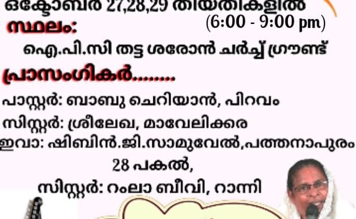 അടൂർ: ഐ.പി.സി തട്ട ശാരോൻ സഭ ഒരുക്കുന്ന സുവിശേഷമഹായോഗവും സംഗീതവിരുന്നും ഒക്ടോബർ 27, 28, 29 തീയതികളിൽ സഭാങ്കണത്തിൽ വൈകിട്ട് 6 മുതൽ 9 വരെ നടക്കും. പാസ്റ്റർ ബാബു ചെറിയാൻ (പിറവം), സിസ്റ്റർ ശ്രീലേഖ (മാവേലിക്കര), ഇവാ. ഷിബിൻ ജി സാമുവേൽ (പത്തനാപുരം) എന്നിവർ പൊതുയോഗങ്ങളിലും സിസ്റ്റർ റംലാ ബീവി (റാന്നി) ഒക്ടോബർ 28 ന് പകൽ നടക്കുന്ന യോഗത്തിലും പ്രസംഗിക്കും. സ്പിരിച്ച്വൽ വേവ്സും ചർച്ച് കൊയറും സംഗീതശുശ്രൂഷയ്ക്ക് നേതൃത്വം നല്കും.