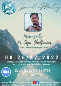 എഡ്മൺറ്റോൺ:കാനഡയിലെ ആൽബെർട്ട എഡ്മൺറ്റോൺ ഫെയിത് ക്രിസ്ത്യൻ അസംബ്ലിയുടെ 2 ദിവസ സ്പെഷ്യൽ മീറ്റിംഗ് ഇന്ന് ആരംഭിക്കും.
