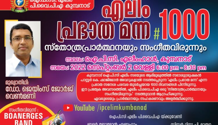 കുമ്പനാട്: ഐ പി സി എലിം സഭയുടെ ആഭിമുഖ്യത്തിൽ പാസ്റ്റർ കെ ഷാജിമോന്റെ നേതൃത്വത്തിൽ നടക്കുന്ന പ്രഭാത സന്ദേശം പരമ്പരയായ ‘എലിം പ്രഭാത മന്ന’ തുടർച്ചയായ ആയിരം ദിവസങ്ങൾ പിന്നിടുന്നു. ഈ അവസരത്തിൽ എലിം പി.വൈ.പി.എ യുടെ നേതൃത്വത്തിൽ സ്തോത്ര പ്രർത്ഥനയും സംഗീതവിരുന്നും സെപ്തംബർ 2 വെള്ളിയാഴ്ച വൈകിട്ട് 6മണിക്ക് കുമ്പനാട് ഐ.പി.സി എലിം ഹാളിൽ വെച്ചു നടക്കും. ഡോ ജെയിംസ് ജോർജ് (വെൺമണി) മുഖ്യ സന്ദേശം നൽകും.