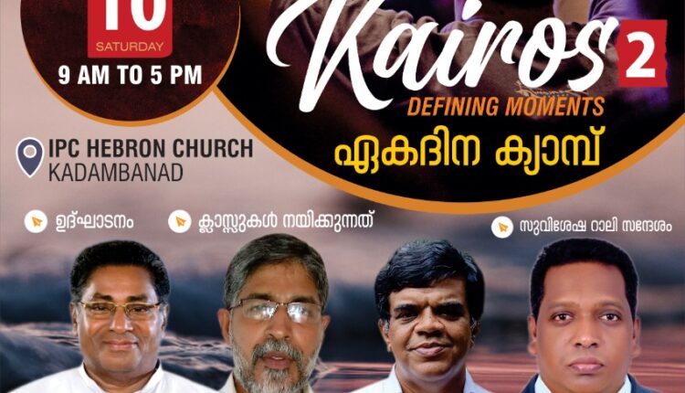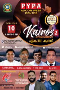 അടൂർ: പി വൈ പി എ അടൂർ വെസ്റ്റ് സെന്റർ ഏകദിന ക്യാമ്പ് (KAIROS -2) 2022 സെപ്റ്റംബർ 10 ശനിയാഴ്ച ഐ.പി.സി ഹെബ്രോൻ കടമ്പനാട് നടക്കും. രാവിലെ 9 മണി മുതൽ നടക്കുന്ന ക്യാമ്പ് ഐപിസി അടൂർ വെസ്റ്റ് സെന്റർ മിനിസ്റ്റർ പാസ്റ്റർ തോമസ് ജോസഫ് ഉദ്ഘാടനം ചെയ്യും.