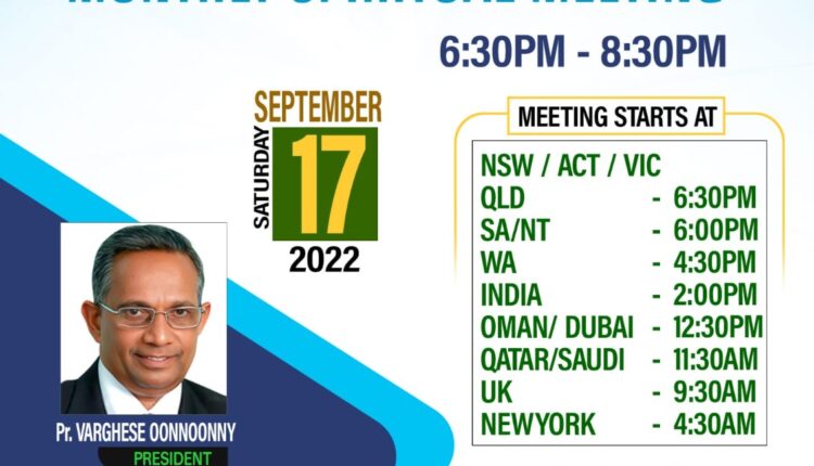മെൽബൺ: ഐ പി സി ഓസ്ട്രേലിയ റീജിയന്റെ സെപ്റ്റംബറിലെ മാസയോഗം സെപ്റ്റംബർ 17 ശനിയാഴ്ച്ച വൈകിട്ട് 6.30 മുതൽ 8.30 വരെ (സിഡ്നി-മെൽബൺ സമയം) ’സൂ’മിലൂടെ നടക്കും. ഐ പി സി ഓസ്ട്രേലിയ റീജിയൻ പ്രസിഡണ്ട് പാസ്റ്റർ വർഗീസ് ഉണ്ണുണ്ണി ശുശ്രൂഷകൾക്ക് നേതൃത്വം നൽകും. പാസ്റ്റർ ബിജു സി എക്സ് (കൊച്ചി) ദൈവ വചനം ശുശ്രൂഷിക്കും. ഐ പി സി ഓസ്ട്രേലിയ റീജിയൻ ക്വയർ (ബ്രദർ ജോബിൻ ജെയിംസ് & ബ്രദർ ടോമി ഉണ്ണുണ്ണി) ഗാന ശുശ്രൂഷകൾക്ക് നേതൃത്വം നൽകും.