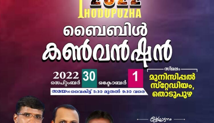 തൊടുപുഴ: ജെരുശലേം ഗോസ്പൽ മിഷനും വിശ്വാസയാത്ര മിനിസ്ട്രിയും ചേർന്നൊരുക്കുന്ന ബൈബിൾ കൺവെൻഷൻ സെപ്റ്റംബർ 30, ഒക്ടോബർ 1 തീയതികളിൽ തൊടുപുഴ മുനിസിപ്പൽ സ്റ്റേഡിയത്തിൽ വെച്ചു നടക്കപെടുന്നതാണ്. പാസ്റ്റർ എച്ച്. ഫ്രാൻസിസ് (പ്രിൻസിപ്പൽ,EIBS മുവാറ്റുപുഴ )ഉത്ഘാടനം ചെയ്യുകയും കർത്താവിൽ പ്രസിദ്ധരായ പാസ്റ്റർ അനിൽ കൊടിത്തോട്ടം, പാസ്റ്റർ ജോയി പാറക്കൽ എന്നിവർ ദൈവവചനം ശുശ്രുഷിക്കുകയും, ഗാനശുശ്രുഷ ജെറുസലേം വോയിസ്, തൊടുപുഴ ചെയ്യുന്നതുമായിരിക്കും.