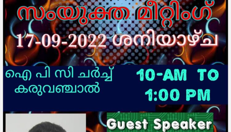 കണ്ണൂർ: ഐപിസി കണ്ണൂർ സെന്ററിന്റെ നേതൃത്വത്തിൽ പാസ്റ്റേഴ്സ് ഫാമിലി & സോദരി സമാജം സംയുക്ത സെമിനാർ നാളെ 17 ശനിയാഴ്ച രാവിലെ 10 മണി മുതൽ 1 മണി വരെ ഐപിസി കരുവഞ്ചാൽ സഭയിൽ വച്ച് നടക്കും. പാസ്റ്റർ മാത്യു പി തോമസ് വടവാതൂർ പ്രസംഗിക്കും. പാസ്റ്റർ പി ജെ ജോസഫും, പാസ്റ്റർ ബിജു തോമസും മീറ്റിംഗിന് നേതൃത്വം നൽകും.