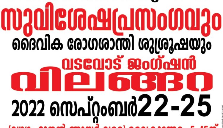 കൊട്ടാരക്കര: ദി പെന്തെക്കൊസ്ത് മിഷൻ വിലങ്ങറ സഭയുടെ ആഭിമുഖ്യത്തിൽ സുവിശേഷ പ്രസംഗം നാളെ സെപ്റ്റംബർ 22 മുതൽ 25 വരെ വിലങ്ങറ വടവോട് ജംഗ്ഷനു സമീപമുള്ള റ്റി.പി.എം ഗ്രൗണ്ടിൽ നടക്കും.