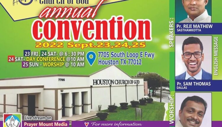ഹൂസ്റ്റൺ: ഹൂസ്റ്റൺ ചർച്ച് ഓഫ് ഗോഡ് സഭയുടെ വാർഷിക കൺവൻഷൻ സെപ്റ്റംബർ 23, 24, 25 തീയതികളിൽ (വെള്ളി, ശനി, ഞായർ) ഹൂസ്റ്റൺ ചർച്ച് ഓഫ് ഗോഡ് സഭാ ഹാളിൽ വച്ചാണ് (7705 South Loop E.Fwy, Housotn, TX 77012) കൺവെൻഷൻ യോഗങ്ങൾ നടക്കും.