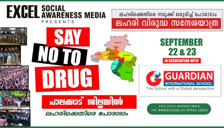 പാലക്കാട് : എക്സൽ സോഷ്യൽ അവയർനസ് മീഡിയയും ഗരുഡിയൻ ഇൻറർനാഷണൽ സ്കൂളും ചേർന്നൊരുക്കുന്ന “ലഹരിക്കെതിരെ പോരാടാം” എന്ന ബോധവത്കരണ സന്ദേശ യാത്ര ഇന്ന് മുതൽ പാലക്കാട് ജില്ലയിൽ വിവിധ സ്കൂളുകളിൽ നടക്കുന്നു. സ്കിറ്റ്, ബോധവത്കരണ സന്ദേശവും, വീഡിയോ പ്രദർശനം, ക്വിസ് മത്സരം, തുടങ്ങിയ പരിപാടികൾ നടക്കും.