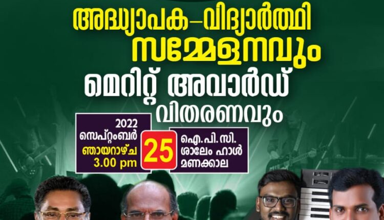 സൺഡേ സ്കൂൾ അസോസിയേഷൻ അധ്യാപക-വിദ്യാർത്ഥി സമ്മേളനവും മെറിറ്റ് അവാർഡ് വിതരണവും 2022 സെപ്റ്റംബർ 25 ഞായറാഴ്ച ഉച്ചകഴിഞ്ഞ് 3 മണി മുതൽ ഐപിസി ശാലേം മണക്കാല സഭയിൽ വെച്ചു നടക്കുന്നു.