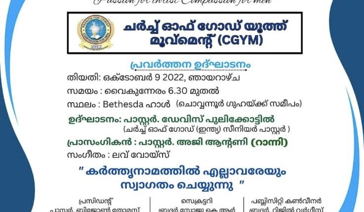 ചൊവ്വന്നൂർ: ചർച്ച് ഓഫ് ഗോഡ് ഇന്ത്യയുടെ യുവജന വിഭാഗമായ C G Y M ന്റെ 2022-2023 വർഷങ്ങളിലെ പ്രവർത്തന ഉദ്ഘാടനവും, ഏകദിന സുവിശേഷയോഗവും ഒക്ടോബർ 9 ന് ഞായറാഴ്ച വൈകുന്നേരം 6.30ന് ചൊവ്വന്നൂർ ഗുഹയ്ക്ക് സമീപമുള്ള ബെഥെസ്ത ഹാളിൽ വെച്ച് നടക്കപ്പെടും. പ്രസ്തുത യോഗത്തിൽ ചർച്ച് ഓഫ് ഗോഡ് ഇന്ത്യയുടെ സീനിയർ ശുശ്രൂഷകൻ പാസ്റ്റർ ഡേവിസ് പുലിക്കോട്ടിൽ പ്രവർത്തന ഉദ്ഘാടനവും, പാസ്റ്റർ അജി ആൻ്റണി (റാന്നി), വചനം ശുശ്രൂഷയും നിർവ്വഹിക്കും. പാസ്റ്റർ ബിജോൺ തോമസ്, സോജു. കെ. ആർ. തുടങ്ങിയവർ പ്രസ്തുത മീറ്റിങ്ങുകൾക്ക് നേതൃത്വം നൽകും.