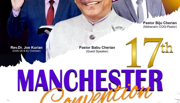 മാഞ്ചസ്റ്റർ: മഹിനയം ചർച്ച് ഓഫ് ഗോഡ് സഭയുടെ ആഭിമുഖ്യത്തിൽ 17 മത് മാഞ്ചസ്റ്റർ കൺവൻഷൻ ഒക്ടോബർ 7 മുതൽ 9 വരെ മാഞ്ചസ്റ്റർ ലൊങ്സൈറ്റ് സ്റ്റോക്ക്പോർട്ട് റോഡിൽ (667/669) ജെയിന് കമ്മ്യൂണിറ്റി സെന്ററിൽ M12 4QE വൈകിട്ട് 5.30 ന് നടക്കും.