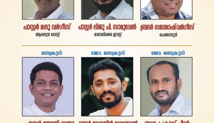 വൈസ് പ്രസിഡൻ്റുമാരായി പാസ്റ്റർ ലിജു പി. സാമുവേൽ (മാവേലിക്കര ഈസ്റ്റ്) സന്തോഷ് വർഗീസ് (ചെങ്ങന്നൂർ), സെക്രട്ടറി സ്ഥാനത്തേക്ക് പാസ്റ്റർ ജോജി രാജു (ആലപ്പുഴ ഈസ്റ്റ്), ജോ. സെക്രട്ടറിയായി ഇവാ. പ്രകാശ് പീറ്റർ