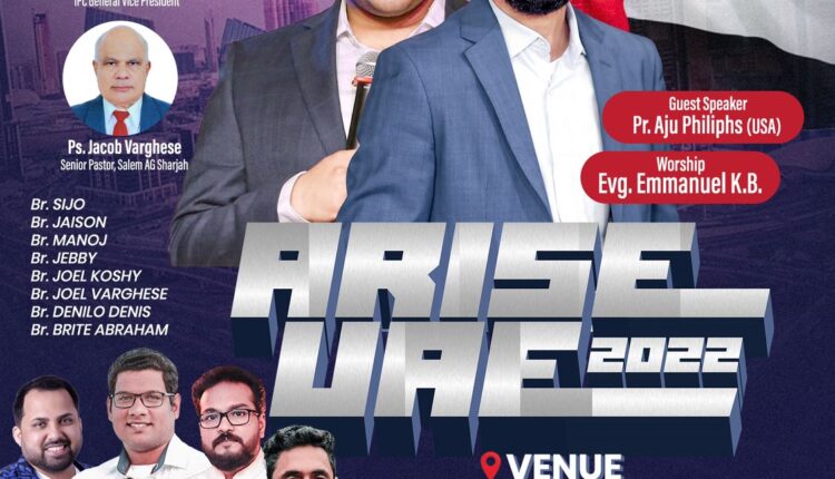 ഷാർജ: 2022 നവംബർ 24 വ്യാഴം രാത്രി 7:30 മുതൽ 10:00 വരെ ഷാർജ വർഷിപ്പ് സെന്റർ മെയിൻ ഹാളിൽ വച്ച് ARISE UAE 2022 എന്ന പേരിൽ സംഗീതസന്ധ്യ നടത്തപ്പെടുന്നു.