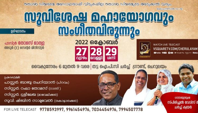 അടൂർ: ഐ പി സി ശാരോൻ തട്ട സഭയുടെ ആഭിമുഖ്യത്തിലുള്ള സുവിശേഷ മഹായോഗവും സംഗീത വിരുന്നും ഇന്ന് മുതൽ 29 ശനി വരെ സഭാ ഗ്രൗണ്ടിൽ വെച്ച് വൈകിട്ട് 6 മണി മുതൽ 9 മണി വരെ നടക്കും. അടൂർ ഈസ്റ്റ് സെന്റർ പാസ്റ്റർ തോമസ് മാത്യു ഉദ്ഘാടനം ചെയ്യുന്ന മീറ്റിംഗിൽ പാസ്റ്റർ ബാബു ചെറിയാൻ(പിറവം), സിസ്റ്റർ ശ്രീലേഖ , സുവി. ഷിബിൻ സാമുവേൽ എന്നിവർ വൈകുന്നേരങ്ങളിലും, സിസ്റ്റർ റംല തോമസ് വെള്ളിയാഴ്ച്ച പകൽ നടക്കുന്ന യോഗത്തിലും വചന ശുശ്രൂഷ നിർവ്വഹിക്കും. സ്പിരിച്വൽ വേവ്സ് അടൂരും, ചർച്ച് ക്വയറും ഗാനശുശ്രുഷയ്ക്ക് നേതൃത്വം നൽകും.