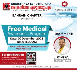 മനാമ: ക്രൈസ്തവ എഴുത്തുപുര ബഹ്റൈൻ ചാപ്റ്ററും കിംസ് ഹെൽത് സംയുക്തമായി സംഘടിപ്പിക്കുന്ന ഫ്രീ മെഡിക്കൽ അവയർനസ് പ്രോഗ്രാം ഡിസംബർ രണ്ടാം തീയതി രാവിലെ 11 മണിക്ക് കിംസ് ഹെൽത്ത് കോൺഫെറൻസ് സെന്ററിൽ വെച്ചു നടക്കും. കിംസ് ഹെൽത്ത് കൺസൾട്ടന്റ് ആൻഡ് കാർഡിയോളജി വിദഗ്ദൻ ഡോ. ജൂലിയൻ ക്ലാസ്സുകൾക്ക് നേതൃത്വം നൽകും.