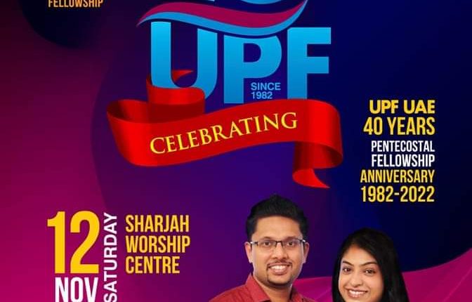 ഷാർജ: യു.എ.ഇയിലെ പെന്തകോസ്ത് സംഘടനകളുടെ ഐക്യകൂട്ടായ്മയായ യു.പി.എഫ് യു.എ.ഇ അതിന്റെ നാല്പതാം വാർഷികം ആഘോഷിക്കുന്നു. ഷാർജാ വർഷിപ്പ് സെന്ററിൽ 2022 നവംബർ 12 വൈകിട്ട് 6:30ന് ആരംഭിക്കുന്ന വാർഷികാഘോഷത്തിൽ ഗായകരായ ഇമ്മാനുവേൽ ഹെൻട്രിയുടെയും ഭാര്യ ശ്രുതി ജോയിയുടേയും ഗാനാലാപനവും പൊതുസമ്മേളനവും നടക്കും. വാർഷികാഘോഷവേളയിൽ യു.പി.എഫ് യു.എ.ഇയുടെ നാളിതുവരെയുള്ള പ്രസിഡന്റ്, സെക്രട്ടറി, ട്രഷറാർ എന്നിവരെ ആദരിക്കും. യു.എ.ഇയിലെ പെന്തക്കോസ്ത് പ്രസ്ഥാനങ്ങൾക്കിടയിൽ സാമൂഹിക പ്രതിബദ്ധതയോടെ പ്രവർത്തിക്കുന്ന യു.പി.എഫ് പെന്തക്കോസ്ത് പ്രസ്ഥാനങ്ങൾക്ക് എന്നും അഭിമാനമാണ്. എല്ലാ ദൈവജനത്തേയും ഈ യോഗത്തിലേക്ക് സ്വാഗതം ചെയ്യുന്നതായി ഭാരവാഹികൾ അറിയിച്ചു.