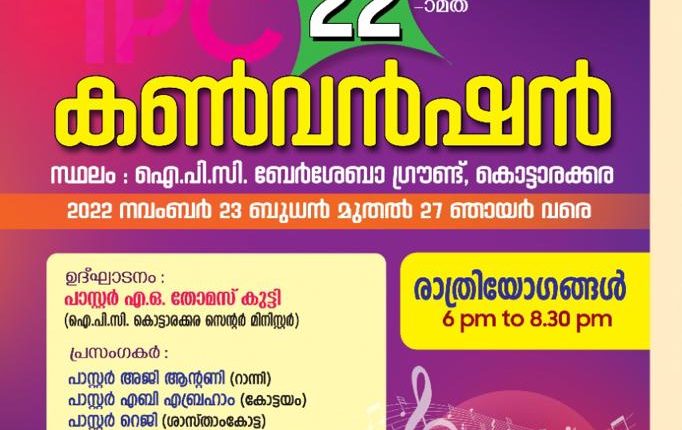 കൊട്ടാരക്കര: ഐപിസി കൊട്ടാരക്കര 22-ാമത് സെന്റർ കൺവൻഷൻ നവംബർ 23 മുതൽ 27 വരെ കൊട്ടാരക്കര ബേർശേബാ ഹാളിൽ നടക്കും .