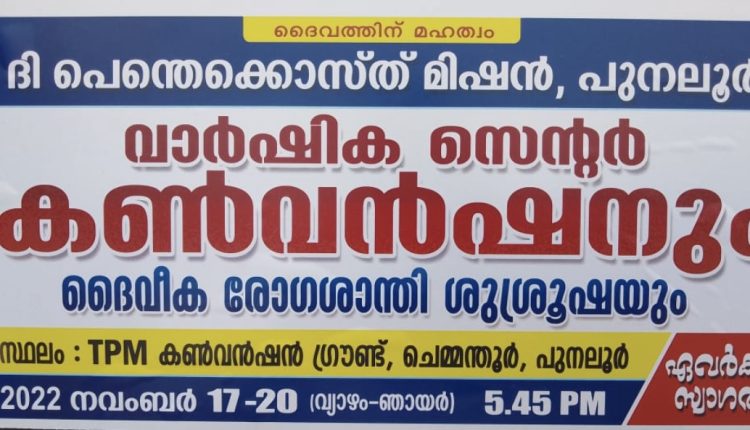 പുനലൂർ: ദി പെന്തെക്കൊസ്ത് മിഷൻ പുനലൂർ സെന്റർ കൺവൻഷൻ നവംബർ 17 വ്യാഴം മുതൽ 20 ഞായർ വരെ ചെമ്മന്തൂര് റ്റി.പി.എം കൺവൻഷൻ ഗ്രൗണ്ടിൽ നടക്കും.