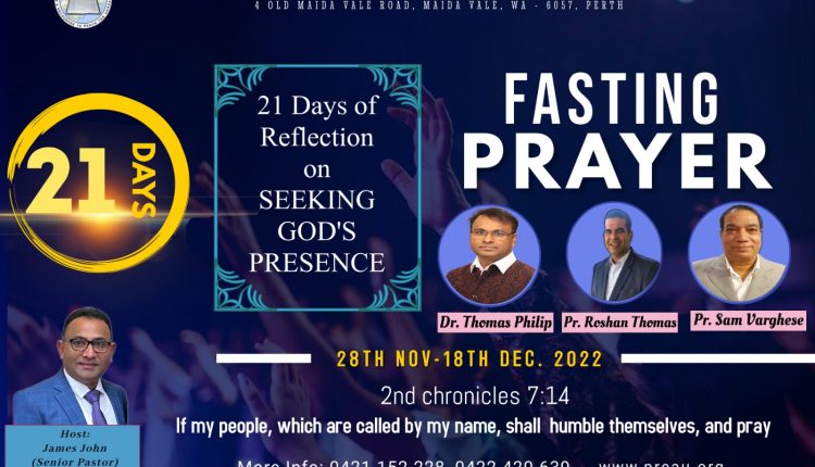 പെര്ത്ത് / (ഓസ്ട്രേലിയ): പെര്ത്ത് റിവൈവൽ ചർച്ചിന്റെ ആഭിമുഖ്യത്തിൽ നവംബർ 28 മുതൽ ഡിസംബർ 18 വരെ 21 ദിവസത്തെ ഉപവാസ പ്രാർത്ഥന നടക്കും.