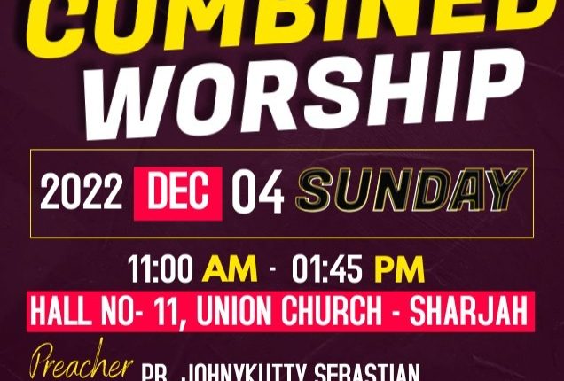 ഷാർജ:അസംബ്ലിസ് ഓഫ് ഗോഡ് യു എ ഇ റീജിയൻ സംയുക്ത ആരാധന ഡിസംബർ 4 ഞായറാഴ്ച രാവിലെ 11 മുതൽ 1:45 വരെ യൂണിയൻ ചർച്ച് ഹാൾ 11ൽ വച്ച് നടക്കും. പാസ്റ്റർ ജോണിക്കുട്ടി സെബാസ്റ്റ്യൻ മുഖ്യസന്ദേശം നൽകും, അസംബ്ലിസ് ഓഫ് ഗോഡ് യു എ ഇ റീജിയൻ കൊയർ ഗാനശിശ്രുഷയ്ക്ക് നേതൃത്വം നൽകും.