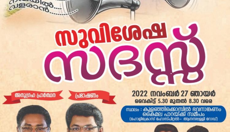 അടൂർ : ഗ്രാമങ്ങളിൽ യേശുക്രിസ്തുവിന്റെ നിർമ്മല സുവിശേഷം എത്തിക്കുക എന്ന സുവിശേഷീകരണ ദൗത്യത്തിന്റെ ഭാഗമായി പി.വൈ.പി.എ അടൂർ വെസ്റ്റ് സെന്റെർ ഐപിസി ഗോസ്പെൽ സെന്റർ മാമ്മൂട് സഭയുടെ സഹകരണത്തോടെ 2022 നവംബർ 27 ഞായറാഴ്ച വൈകിട്ട് 5:30 മുതൽ മാമ്മൂട് കൈമലപ്പാറക്ക് സമീപം കുളഞ്ഞികൊമ്പിൽ ഭവനാങ്കണം സുവിശേഷ സദസ്സ് നടക്കും.