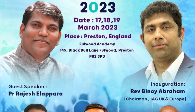 പ്രസ്റ്റൻ: 16 മത് ഐ എ ജി യു കെ & യൂറോപ്പ് നാഷണൽ കോൺഫ്രൻസ് 2023 മാർച്ച് 17 മുതൽ 19 വരെ ഇംഗ്ലണ്ടിലെ പ്രെസ്റ്റൻ പട്ടണത്തിൽ വെച്ച് നടക്കും. കോൺഫ്രൻസിൽ സഹോദരിമാർക്കും, യുവജനങ്ങൾക്കും, കുഞ്ഞുങ്ങൾക്കും ഉള്ള പ്രത്യേക സെക്ഷനുകൾ നടക്കും.