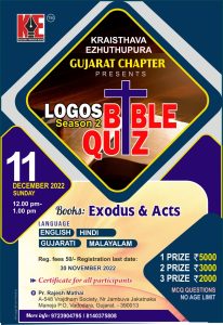 ക്രൈസ്തവ എഴുത്തുപുര ഗുജറാത്ത് ലോഗോസ് ബൈബിൾ ക്വിസ് സീസൺ 2 നാളെ