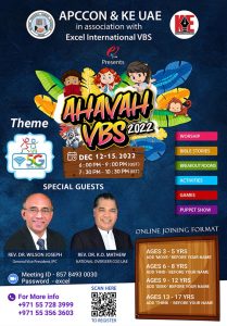 അബുദാബി: മൂല്യാധിഷ്ഠിതമായ ഒരു ക്രിസ്തീയ തലമുറയെ വാർത്തെടുക്കുക എന്ന ഉദ്ദേശത്തോടുകൂടി ,അബുദാബി പെന്തകോസ്ത് ചർച്ചസ് കോൺഗ്രിഗേഷനും (APCCON), ക്രൈസ്തവ എഴുത്തുപുര യു എ ഇ ചാപ്റ്ററും സംയുക്തമായി ഒരുക്കുന്ന വിന്റർ വിബിഎസ് ‘അഹവാ’ ഡിസംബർ 12 മുതൽ 15 വരെ ഓൺലൈൻ ഫ്ലാറ്റ് ഫോം സൂമിൽ നടക്കും.