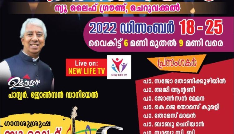 ചെറുവക്കൽ: ഐ.പി.സി വേങ്ങൂർ സെന്ററിന്റേയും കിളിമാനൂർ ഏരിയയുടേയും ന്യൂ ലൈഫ് ബിബ്ലിക്കൽ സെമിനാരിയുടേയും സംയുക്ത ആഭിമുഖ്യത്തിൽ നടത്തപ്പെടുന്ന 30-ാമത് ചെറുവക്കൽ കൺവൻഷൻ നാളെ (18.12.2022) ആരംഭിക്കും. എട്ട് ദിവസങ്ങളിലായി ചെറുവക്കൽ ന്യൂ ലൈഫ് ഗ്രൗണ്ടിൽ നടക്കുന്ന കൺവൻഷൻ സെന്റർ മിനിസ്റ്റർ പാസ്റ്റർ ജോൺസൻ ഡാനിയേൽ ഉദ്ഘാടനം ചെയ്യും. പാസ്റ്റർമാരായ സജോ തോണിക്കുഴി, അജി ആന്റണി, ജോൺസൻ മേമന, കെ.ജെ തോമസ്, തോമസ് മാമ്മൻ, ബാബു ചെറിയാൻ, സാബു സി.ബി, കെ.പി. ജോസ് എന്നിവർ വചന ശുശ്രൂഷ നിർവ്വഹിക്കും. ന്യൂ ലൈഫ് സിംഗേഴ്സ് ഗാനശുശ്രൂഷകൾക്ക് നേതൃത്വം നൽകും. ദിവസവും വൈകിട്ട് 6 മുതൽ 9 വരെയാണ് പൊതുയോഗങ്ങൾ ക്രമീകരിച്ചിരിക്കുന്നത്. 23 വെള്ളി ഉച്ചയ്ക്ക് 2 മുതൽ സോദരി സമാജം വാർഷികവും, 24 ശനി രാവിലെ 9 മുതൽ ജീവകാരുണ്യ പ്രവർത്തനങ്ങളുടെ വിതരണോദ്ഘാടനവും, ഉച്ചയ്ക്ക് 2 മുതൽ സെന്റർ സണ്ടേസ്കൂൾ, പി.വൈ.പി.എ വാർഷികവും നടക്കും.