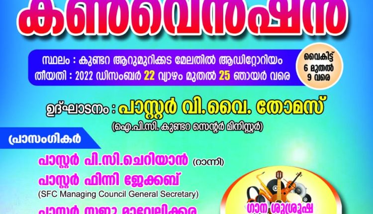 കുണ്ടറ: ഇന്ത്യാ പെന്തക്കോസ്ത് ദൈവസഭ കുണ്ടറ സെൻ്ററിൻ്റെ 20-ാമത് വാർഷിക കൺവൻഷൻ ഡിസംബർ 22 വ്യാഴം മുതൽ 25 ഞായർ വരെ കുണ്ടറ ആറുമുറിക്കട മേലേതിൽ ആഡിറ്റോറിയത്തിൽ വെച്ച് നടത്തപ്പെടും. സെൻ്റർ ശുശ്രൂഷകൻ പാസ്റ്റർ വി. വൈ. തോമസ് ഉത്ഘാടനം ചെയ്യും. പാസ്റ്റർ പി. സി. ചെറിയാൻ, പാസ്റ്റർ ഫിന്നി ജേക്കബ് (SFC Managing Council General Secratary), പാസ്റ്റർ സജു മാവേലിക്കര, പാസ്റ്റർ സാം ജോർജ് (ഐപിസി ജനറൽ സെക്രട്ടറി) എന്നിവർ വിവിധ ദിവസങ്ങളിലായി ദൈവ വചനം പ്രഘോഷിക്കും. താബോർ വോയ്സ് ഉമ്മന്നൂർ ഗാനശുശ്രൂഷ നിർവ്വഹിക്കും.