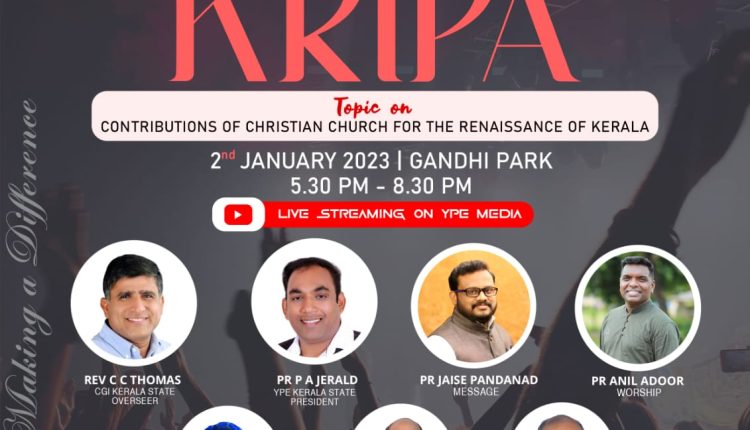 തിരുവനന്തപുരം: ചർച്ച് ഓഫ് ഗോഡ് (ഫുൾ ഗോസ്പൽ) ഇന്ത്യ, ശതാബ്ദി കൺവെൻഷനോടാനുബന്ധിച്ച്, വൈ പി ഇ തിരുവനന്തപുരം മേഖലയുടെ ആഭിമുഖ്യത്തിൽ, ‘കൃപ ‘യുവജന സംഗമവും സംഗീത വിരുന്നും ഒരുക്കുന്നു. 2023 ജനുവരി 2 ന്, തിരുവനന്തപുരം ഗാന്ധിപാർക്കിൽ വൈകുന്നേരം 5:30 മുതൽ 8:30 വരെയാണ് യോഗം നടക്കുക.